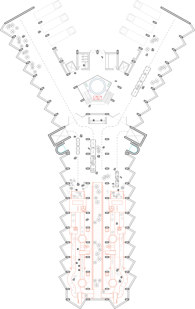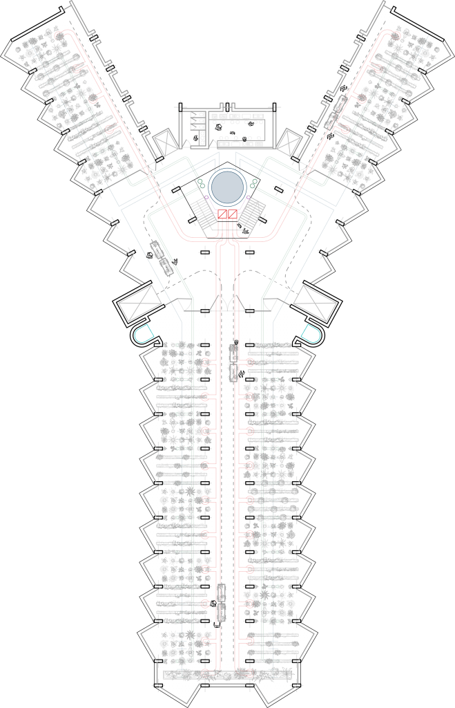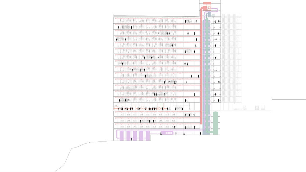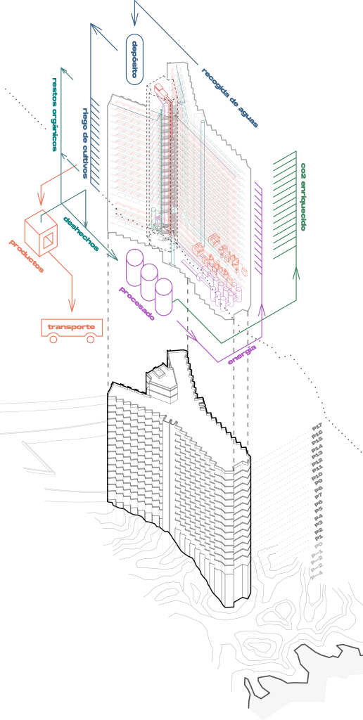 Se utilizan las 24 plantas para alojar cultivos y un centro de producción de alimentos, que contribuya a la autosuficiencia de la isla. La intervención se limitará a “envolver” y equipar el edificio con un sistema eficiente que produzca y recicle.