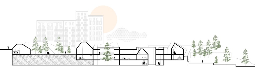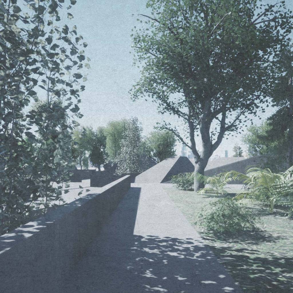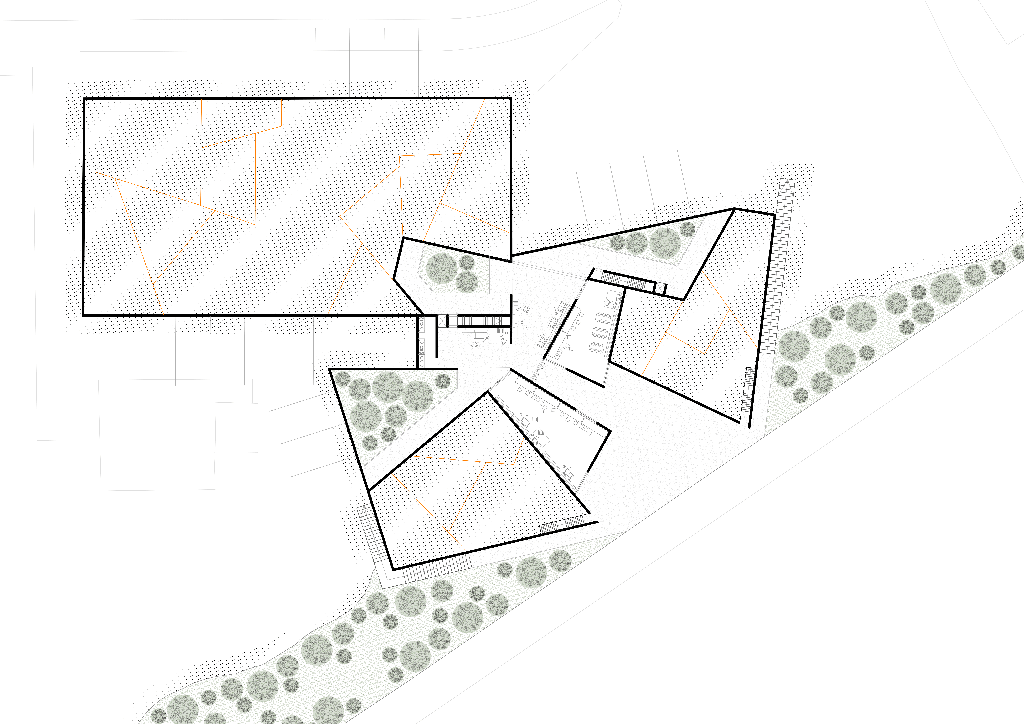 La geometría se debe a la voluntad de escapar de unos duros ejes cartesianos impuestos por la cimentación existente. Este proyecto pretende romper con un resto artificial y olvidado, pasando a ser parte de un organismo verde y útil.